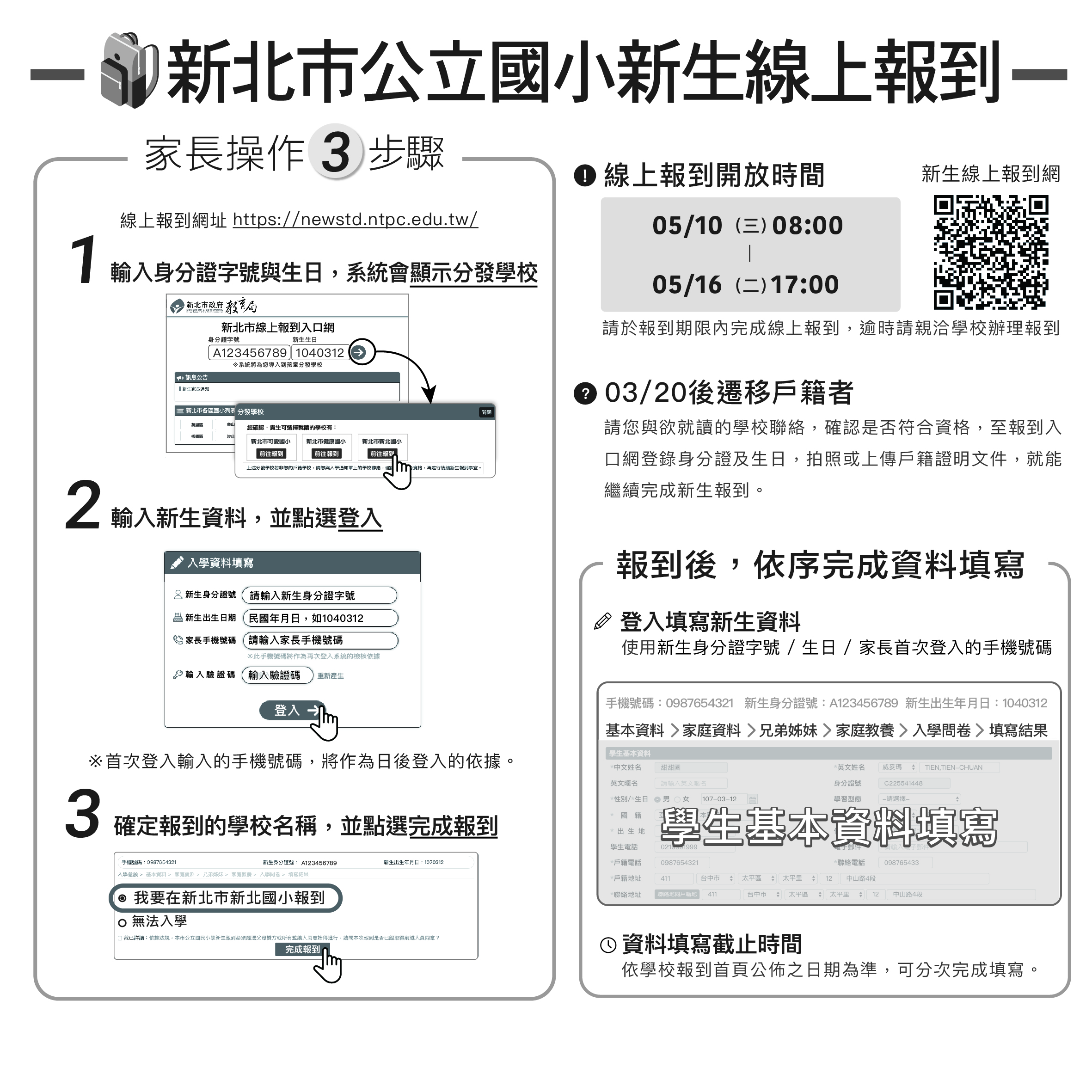 1、請家長至本市國小新生報到入口網(https://newstd.ntpc.edu.tw/),依說明輸