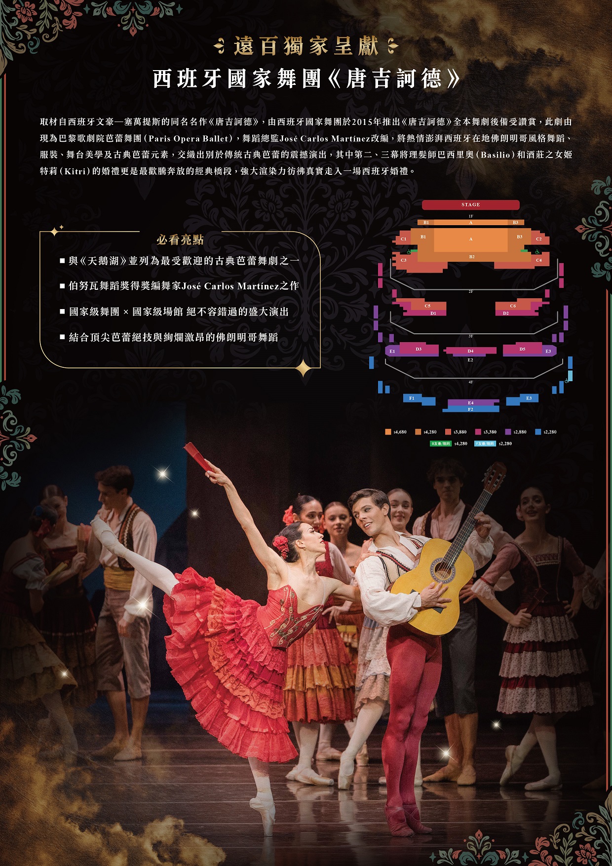 (五)本次演出版本由現任巴黎歌劇院芭蕾舞團舞蹈總監、伯努瓦舞蹈獎(Benois de la Danse)得主 José CarlosMartínez 改編創作。Martínez 以19世紀「古典芭蕾之父」莫里斯.佩蒂帕(Marius Petipa)的經典版本為基礎,在尊重古典技術體系與結構框架的前提下,融入更鮮明的西班牙文化元素,使人物性格更加立體,並透過舞段節奏與場景轉換的流動設計,讓敘事更為緊湊而富層次。